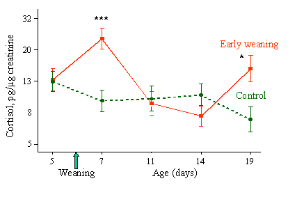 Recent data obtained in the study of early weaning (6 days) in pigs illustrate the interest of such a psychoendocrine approach for the study of animal welfare. As shown in figure 3, early weaning strongly reduced the growth rate of piglets, mostly because of a low ingestion of dry food during the first days after weaning. Urinary cortisol levels increased the day after weaning and rapidly returned to control levels afterwards (Fig. 4). Indeed, weaning has already been shown to increase cortisol secretion using plasma sampling, even at later ages (Carroll et al., 1998; Dantzer and Morm�de, 1981; Kanitz et al., 1998), and from this result, it could be concluded that early weaning induces a short-lasting stress, not much different from classical weaning at 3-5 weeks.