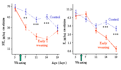 The picture is however different when considering the changes in catecholamine excretion (Fig.5). Noradrenaline concentration in urine showed a sharp and persistent decline and did not return to control levels until day 19, 2 weeks after weaning. Adrenaline concentration in urine remained stable until day 11, but therefore dropped down to very low levels until the end of the experiment. These results can be explained by the role played by catecholamines in energy regulation. Noradrenaline is mainly calorigenic through fat mobilisation and activation of brown adipose tissue metabolism. Thus, the activity of the noradrenergic system is tightly coupled to energy balance. Therefore the drop of noradrenaline likely reflects an energy saving mechanism related to the shortage of energy intake (Young and Landsberg, 1977). Indeed early weaned piglets spent more time under the infrared lamp and huddled together more than control animals, these thermoregulatory behaviours showing the deficit of metabolic thermogenesis.