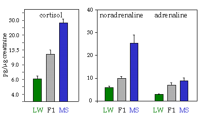 Figure 6. Concentration of cortisol and catecholamines in urine from Meishan and Large White lactating sows and their F1 hybrids
