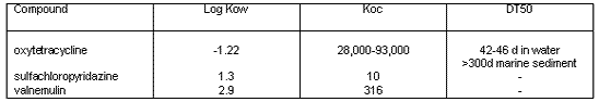 Data was available on the sorption behaviour and biodegradability of oxytetracycline (Table 1). No data were available on the degradability of valnemulin or sulfachloropyridazine. The sorption coefficient for oxytetracycline was high, indicating that it is likely to partition extensively to soils and that it has a low potential to leach. Moreover, the degradation rates in water indicate that oxytetracycline will persist. In contrast, the properties of sulfachloropyridazine indicate that it will readily leach.