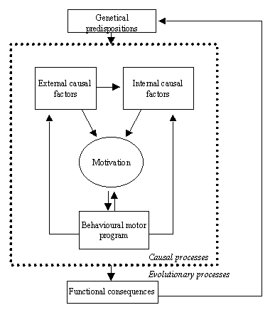 Figure 1. A conceptual motivational model showing the different causal and feedback pathways that need to be considered in a motivational analysis. The evolutionary processes are not necessarily accessible to the animals and the functional significance of a behaviour therefore has no immediate effect on the causal events. However, the whole causal system is shaped by evolution.