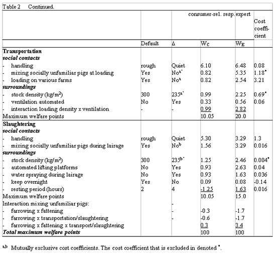 The attributes presented in Table 2 are in order of decreasing chain pig welfare coefficients of the consumer-related respondent. The values of attribute levels that were quantified in open?end questions are also shown. In correspondence to the general perception (Table 1), both the consumer-related respondent and the expert regarded the fattening stage as most important with respect to the overall welfare of the pigs.