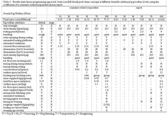 Table 3 Results static linear programming approach: least-cost (Dfl./head) pork chain concepts at different desirable additional pig welfare levels, using the coefficients of a consumer-related respondent and an expert.