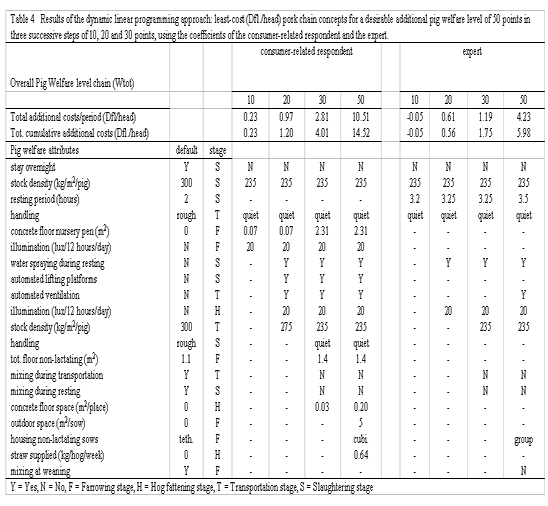 Table 4 Results of the dynamic linear programming approach: least-cost (Dfl./head) pork chain concepts for a desirable additional pig welfare level of 50 points in three successive steps of 10, 20 and 30 points, using the coefficients of the consumer-related respondent and the expert.